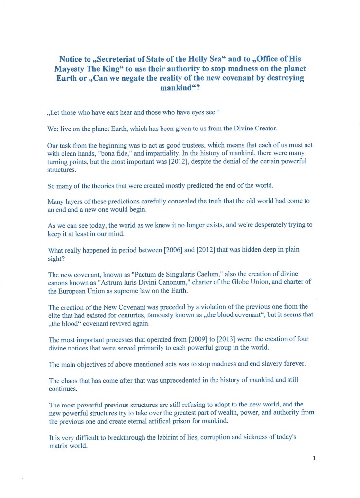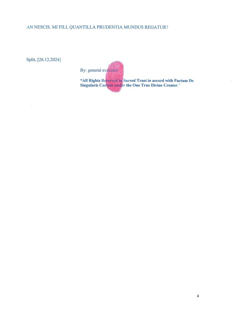 Neka svi sadašnji i budući svjedoče sljedečem zapisu događaja kao našoj božanskoj obavijesti o neuspjelom procesu kontrole uma od strane “navodnih” boraca protiv korone i “navodnih” boraca za čovjeka. Neka bude poznato da je na sveti Ucadia dan GAIA E1:Y13:A25:S2:M23:D1 ova božanska obavijest kreirana i daje se na znanje cijelom univerzumu da proces kontrole uma od strane “navodnih” boraca protiv korone i “navodnih” boraca za čovjeka nije uspio u . Ova obavijest je data cijelom univerzumu i jasno ukazuje da svatko tko je sudjelovao u raznoraznim ulogama ovom procesu da me se u potpunosti potčini nije niti može biti dio božanskog univerzuma . Ako mi u roku od 7 dana od objave obavijesti isti oni koji su to radili, a prepoznali su se na raznorazne načine ne pošalju pojedinačnu obavijest kojom dokazuju da je ovo što navodim neistinito i netočno smatrajte ovu božansku obavijest važečom, nunc pro tunc. Obavijest pošaljite na generalni poštanski ured koja mi je grubo uzrupiran i gdje sam bio konstantno omalovažavan tijekom procesa kontrole uma u kojem ste sudjelovali.