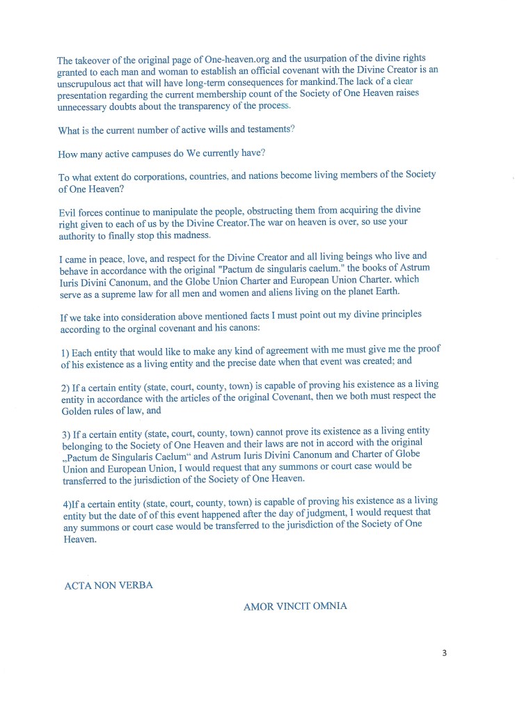 Neka svi sadašnji i budući svjedoče sljedečem zapisu događaja kao našoj božanskoj obavijesti da ne silazimo s isusovog puta bez obzira koje se zlo na tom putu nalazilo u pokušaju da nas odvede od istine i pretvori u jeftine materijalne mizantrope. Neka bude poznato da je na sveti Ucadia dan GAIA E1:Y13:A25:S2:M23:D1 ova božanska obavijest kreirana. Mi: trojstvo duha uma i tijela dajemo ovu božansku obavijest jer onaj koji je umro za sve nas svojim je činom otkupio sve naše grijehe. Ova obavijest je data cijelom univerzumu i jasno ukazuje da svatko tko je boravio u razdoblju od MONS E8:Y3187:A6:S1:M29:D2 do GAIA E1:Y13:A25:S2:M23:D1 u uredu generalnog izvršitelja za GORAN BOBAN Estate, pritom nikad ne upoznavši moje božanske roditelje i mene sa stvarnom činjenicom o istome da je počinio jedan od največih zakonitih zločina. Ako mi u roku od 7 dana od objave obavijesti ne pošaljete obavijest kojom dokazujete da je ovo što navodim neistinito i netočno smatrajte božansku obavijest važečom, nun pro tunc. Obavijest pošaljite na generalni poštanski ured koja mi je grubo uzrupiran i gdje sam bio konstantno omalovažavan tijekom procesa kontrole uma.]